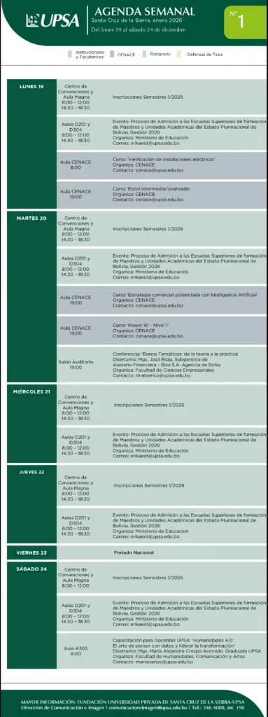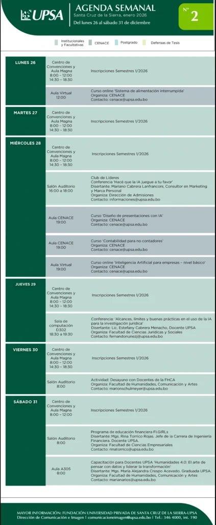 La Universidad Privada de Santa Cruz de la Sierra (UPSA) desarrolló durante la gestión 2025, 15 conferencias dentro del 4° ciclo de la Cátedra Libre Manfredo Kempff Mercado, un espacio académico que rinde homenaje a uno de los pensadores bolivianos más influyentes del siglo XX y que promueve el análisis crítico de los desafíos políticos, …