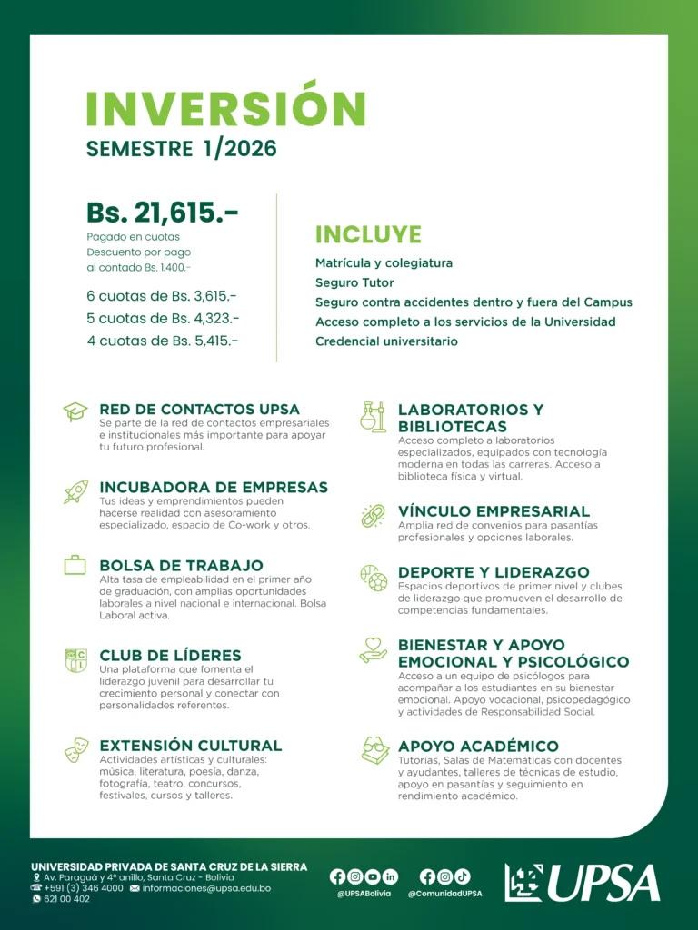 La admisión del estudiante se realiza mediante entrevista personal evaluada. Todo interesado debe llenar el Formulario de Admisión que se encuentra disponible en : www.upsa.edu.bo/proceso-de-inscripcion.